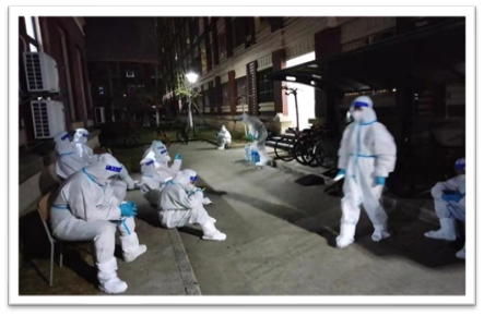 4月10日上午,学院有学生核酸异常,张曼作为校冲锋队员,立刻套上“大白”,第一时间来到学生身边,为异常学生多次进行抗原检测,陪护密接学生去隔离点隔离。杨俊情老师自4月9日起就一直发着低烧,但仍坚持到现场,为学生服务,与异常学生家长沟通做好思想工作。李艳妮和庞学雅分别负责北四和北五学生宿舍楼,廖艺晗、龚敬雅值守在南二门外,调兵遣将,召集学生志愿者,披挂上“大白”,王加宁书记作战前动员,并一一为“大白”写上名字。每层楼安排3位“大白”,实施值守,协助做核酸,发放餐盒,每天忙到子夜时分,辅导员廖艺晗更是忙到角膜炎复发也不管不顾。副书记马冯莉虽然在校外,但是一天中的大部分时间值守在电脑旁,不停的上传下达,就像个飞行指挥塔台,不停地告诉起飞在外的飞行员们(辅导员)上级的要求、指示和手势。