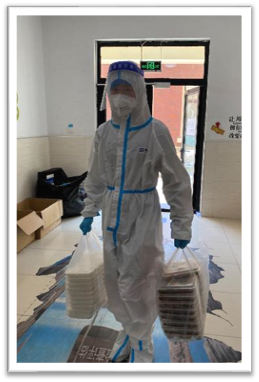 自南区寝室核酸混检出现异常后,全校进入了紧急的封寝管理阶段。职业技术学院一共近900名在校生,封寝隔离期间,吃饭的配送是一个大问题。一个个志愿者也从普通的学生中冒出来,穿上“大白”,为每一位同学输送防疫物资,抗原试剂,送水送饭,同时每顿饭后还需要进行垃圾清运和每天的楼层值班等等,工作内容看似简单,强度却非常大,一日三餐上千次的配送,一楼到六楼反复来回的距离,各民族的饮食忌口等等,都需要在短时间内完成,平均每天12小时的志愿时长,防护服里永远充满着水汽,学生说:自己穿上防护服后,更加理解了一线医务工作者的辛苦,每天收工后,看着脸上的勒痕,湿透的口罩,也更加坚定了为抗疫做出贡献的决心。目前仍旧每天都有学生踊跃报名“大白”的工作,截止今天已有近60人的“大白”战士在宿舍楼层中默默付出。