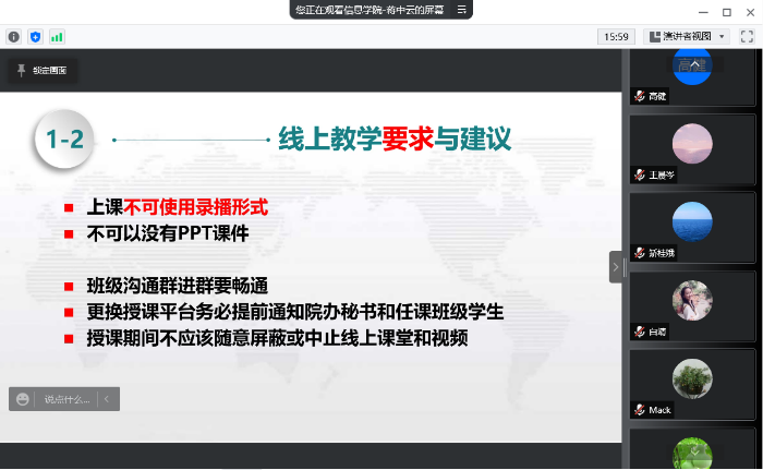 张文俊院长充分肯定了老师们疫情下言传身教传递正能量的做法,希望网络工程系各位老师一起努力,共同渡过疫情的难关。同时希望老师们能够与学生多沟通、交流,舒缓学生的不良情绪和紧张压力。