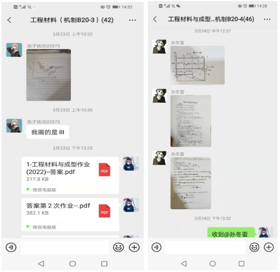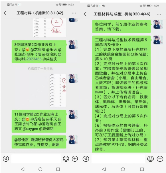 第一,每天上课,要求同学们开启摄像头,进行班级合影,合影发在班级微信群:方便点名;让上课更有仪式感,防止部分出现同学挂课。第二,课堂直播时进行录播,课后将课堂录像上传教学平台,方便学生看回放。第三,通过对分易平台发送信息到学生手机和微信发班级群两种方式,及时催交作业。每周进行知识点总结,布置本周作业及预习。第四,上课过程中,加强与学生的互动,抽查部分学生,让学生发送题目答案至微信群;课后,为了督促学生完成作业,在班级随机抽几位同学,要求在规定的时间将作业发至班级群或者私信老师。第五,定期在微信群进行优秀作业展览,鼓励优秀学生,同时可以起到激励其他同学的作用。