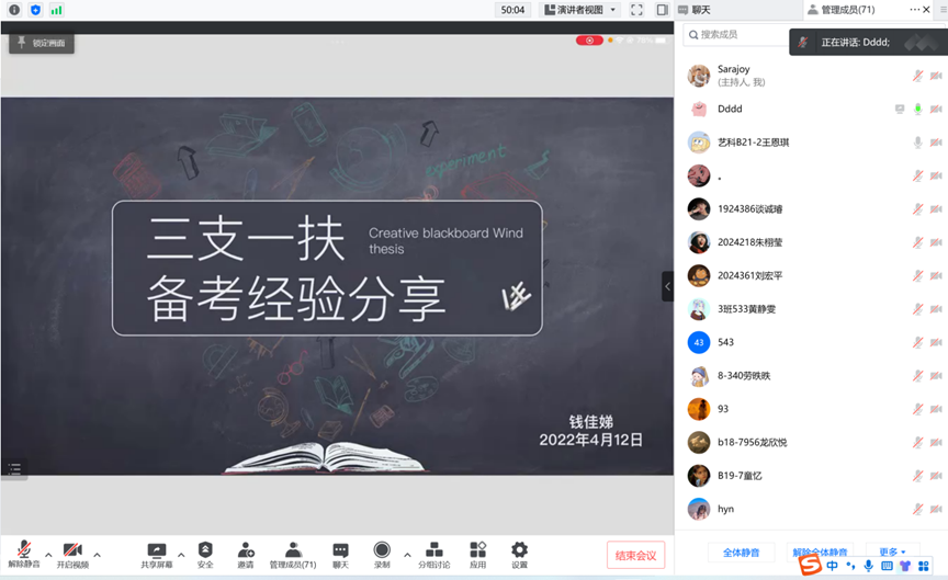 会上,两位成功考取“三支一扶”和事业单位的校友在线分享宝贵的备考经验。许丁同学首先向同学们介绍了什么是事业单位,其次从职业发展、岗位收入、工作稳定性等方面分析事业单位的优势,通过表格清晰地为大家展示了目前事业单位在招聘应届生、往届生时的比例和要求。钱佳娣同学则从什么是“三支一扶”出发,详细介绍了“三支一扶”报考条件、服务期间的待遇、服务期满后的优惠政策以及各项招募流程等,同时结合自身经验向同学们分享了她的备考方法和答题技巧。