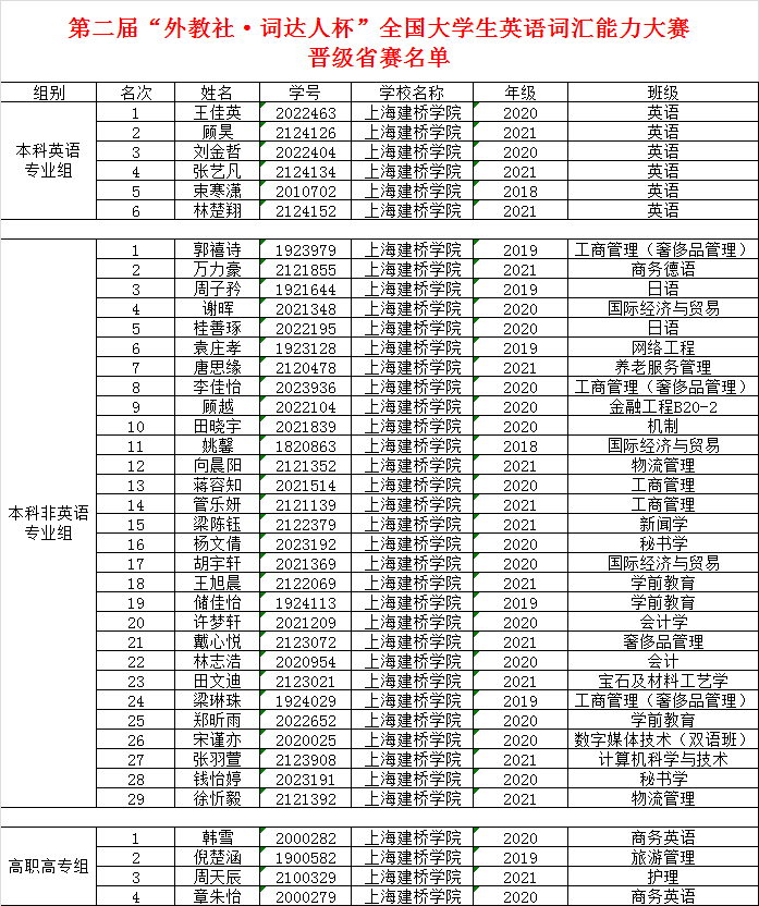 4月15日下午3点,第二届“外教社•词达人杯”全国大学生英语词汇能力大赛上海建桥学院校赛正式开始。本次比赛由外国语学院主办,分为本科英语专业组、本科非英语专业组、高职高专组等三个组别,共吸引了来自全校的753名学生参加,经过一个小时的激烈角逐,本科英语专业组王佳英等6位同学,本科非英语专业组郭禧诗等29位同学以及高职高专组韩雪等4位同学成功晋级上海市省赛(详细名单见文末)。上海市省赛将于5月21日晚8点举行。