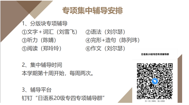 疫情的影响仍在持续,学生们在封闭环境下更容易感到不安,部分学生对即将到来的日语专四考试感到十分焦虑。为了从课业以及心理两方面为学生们提供帮助,日语系全体专职老师和部分兼职老师努力为同学们搭建更专业更全面的线上学习交流平台,希望同学们可以不受外部环境影响,静下心来为日语专四考试作最后阶段的冲刺。(供稿:外国语学院日语系)