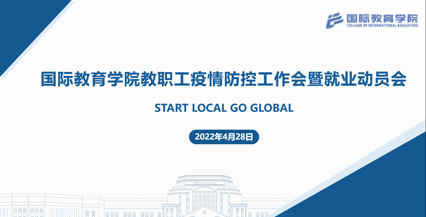 为积极响应市委“动态清零”总方针,打好疫情攻坚战,提升教师使命感、责任感,同时持续推进2022届就业工作,国际教育学院于4月28日下午在线上召开了“同心抗疫 国教有你——国际教育学院教职工疫情防控工作会暨就业动员会”,学院领导班子、教职工全员出席,会议由院办主任张文静主持。