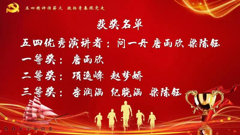 经过激烈的角逐,本次比赛共产生五四优秀演讲者3名,一等奖1名,二等奖2名,三等奖3名。