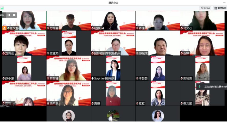 5月26日下午,国际教育学院以腾讯会议的形式线上召开“国际教育学院2022年度安全稳定工作全院大会”。院长梁月泉、党总支书记周英芬、副院长刘潇滢、党总支副书记高祺及全体教职工出席,会议由院办主任张文静主持。
