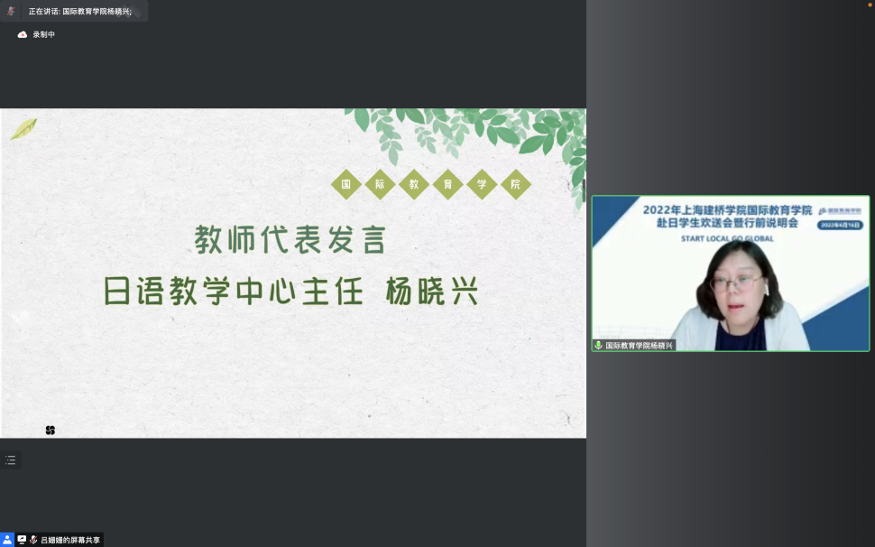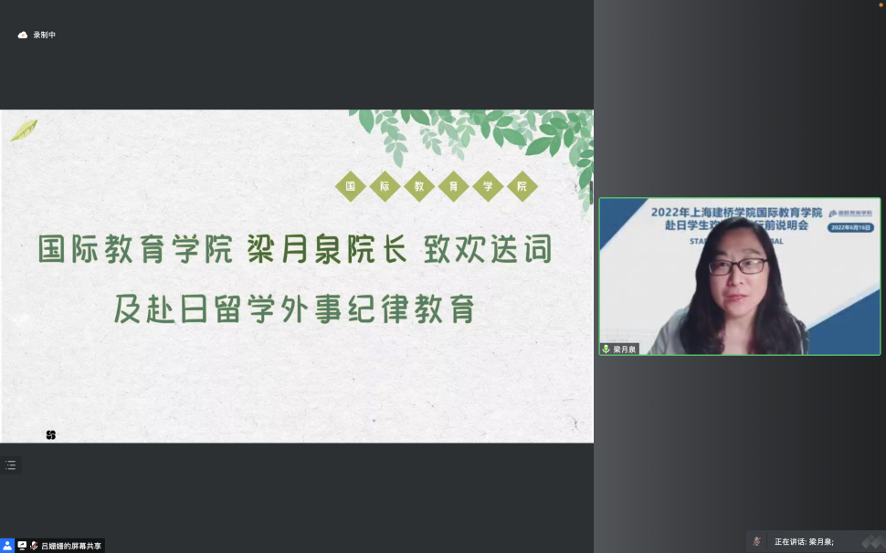 学校对外交流办公室主任、国际教育学院院长梁月泉致欢送词并进行赴日留学外事纪律教育。梁月泉院长表示很高兴有这样一次机会与各位同学线上话别,并向各位同学送上学校和学院的嘱托与祝福,同时对同学们在疫情下对求学锲而不舍的坚持与努力,以及各位领导和老师对中日项目的支持和付出表示感谢。她表示2022年是中日邦交正常化50周年,本次赴日意义重大,强调同学们应树立大安全教育观,确保自身人身安全、学业安全,顺利度过海外留学,并希望同学们欣喜赴日,学成归来。