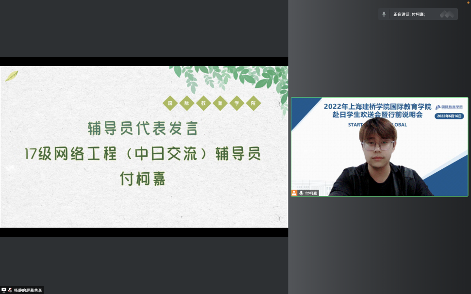 6月16日晚,2022年上海建桥学院国际教育学院赴日学生欢送会暨行前说明会在腾讯会议平台召开。国际教育学院院长梁月泉、党总支书记周英芬、副院长刘潇滢、党总支副书记高祺、对外交流办公室副主任陈栋鑫、京都情报大学院大学上海事务所所长任兵等领导及各专业主任、院办主任、赴日学生辅导员等老师出席会议,2017级、2018级即将赴日的167名学生参加会议。会议由高祺副书记主持。