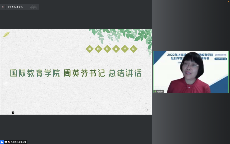 国际教育学院领导和老师们为即将赴日留学的同学们送上殷殷嘱托、美好祝愿,在这温馨感人的氛围中,刘潇滢副院长表示,看到各位领导、老师们对赴日学生的临行寄语,看到同学们一张张熟悉的面孔,深受感动。她介绍了中日项目作为我校优质国际项目的总体情况,指出2022年度预计赴日留学257人,其中包括受疫情影响在国内进行网课学习的2017级部分学生、2018级学生,和计划9月赴日的2019级学生。其中2017级、2018级学生已顺利获取签证,计划7月开始陆续赴日学习。