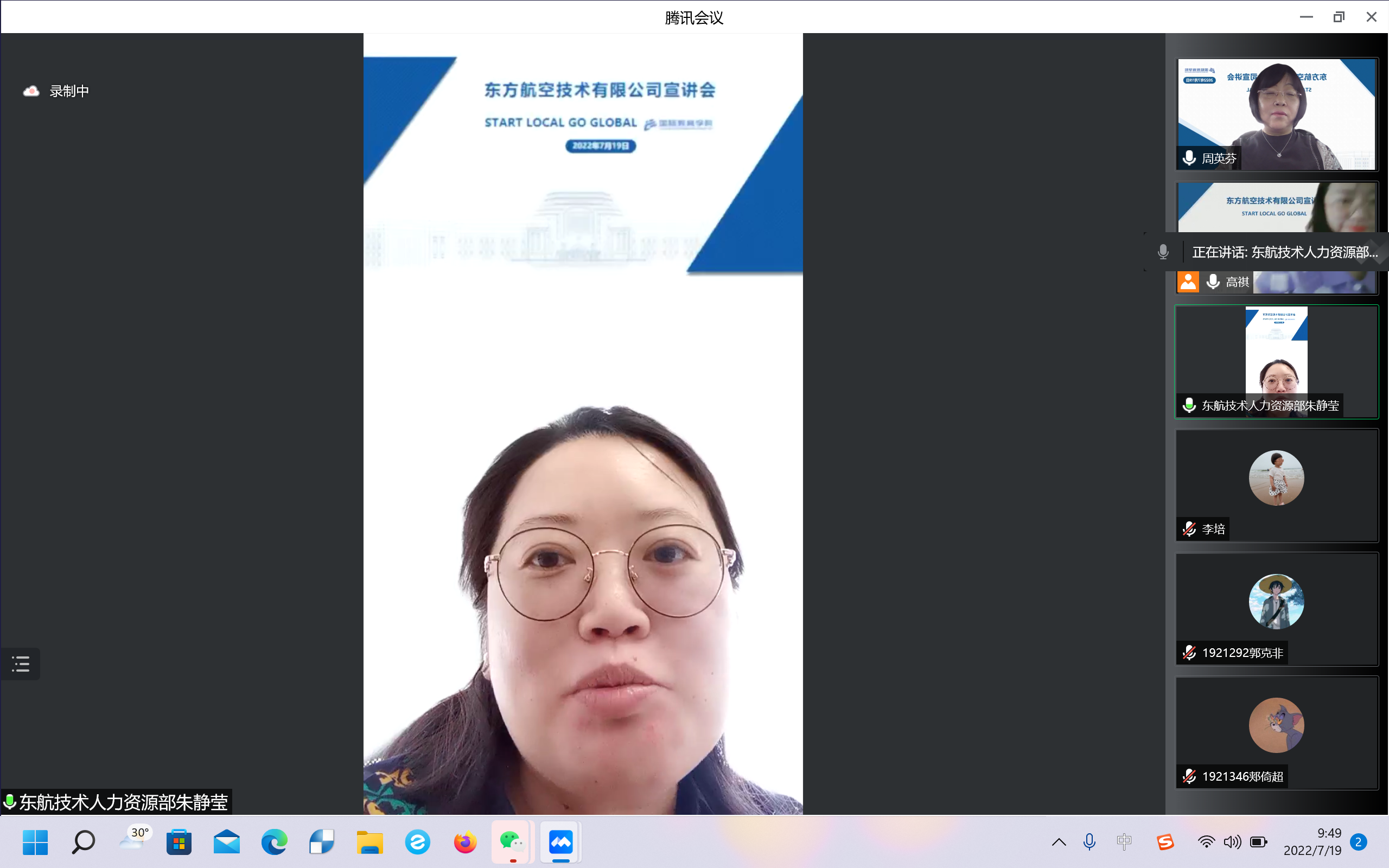 7月19日上午,东方航空技术有限公司通过视频会议形式为国际教育学院2022届毕业生、2023届部分专业毕业生开展线上宣讲会。我院党总支书记周英芬、副书记高祺、机械设计制造及其自动化(中外合作办学)专业主任李培、辅导员孙莉、付柯嘉等老师出席,东方航空技术有限公司人力资源部朱静莹经理做宣讲。会议由高祺副书记主持。