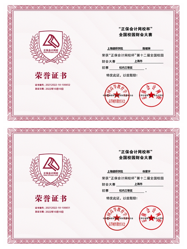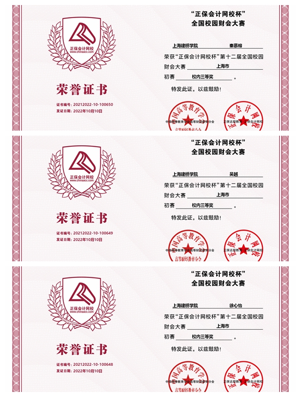 近日,“正保会计网校杯”第十二届全国校园财会大赛校园初赛落下帷幕。商学院会计系同学克服疫情重重困难,经过激烈竞争角逐,喜获佳绩并成功晋级全国复赛。其中,李欣、涂艺超、曹婷婷同学分别获得上海市一等奖、二等奖、三等奖。李欣、涂艺超同学获得校内一等奖,曹婷婷、曹柯仪、陈晨同学获校内二等奖,徐心怡、吴越、秦慕榕、倪星宇、陈堰琳同学获校内三等奖。指导老师黄怡婕、徐洁、刘姝获优秀指导教师奖。