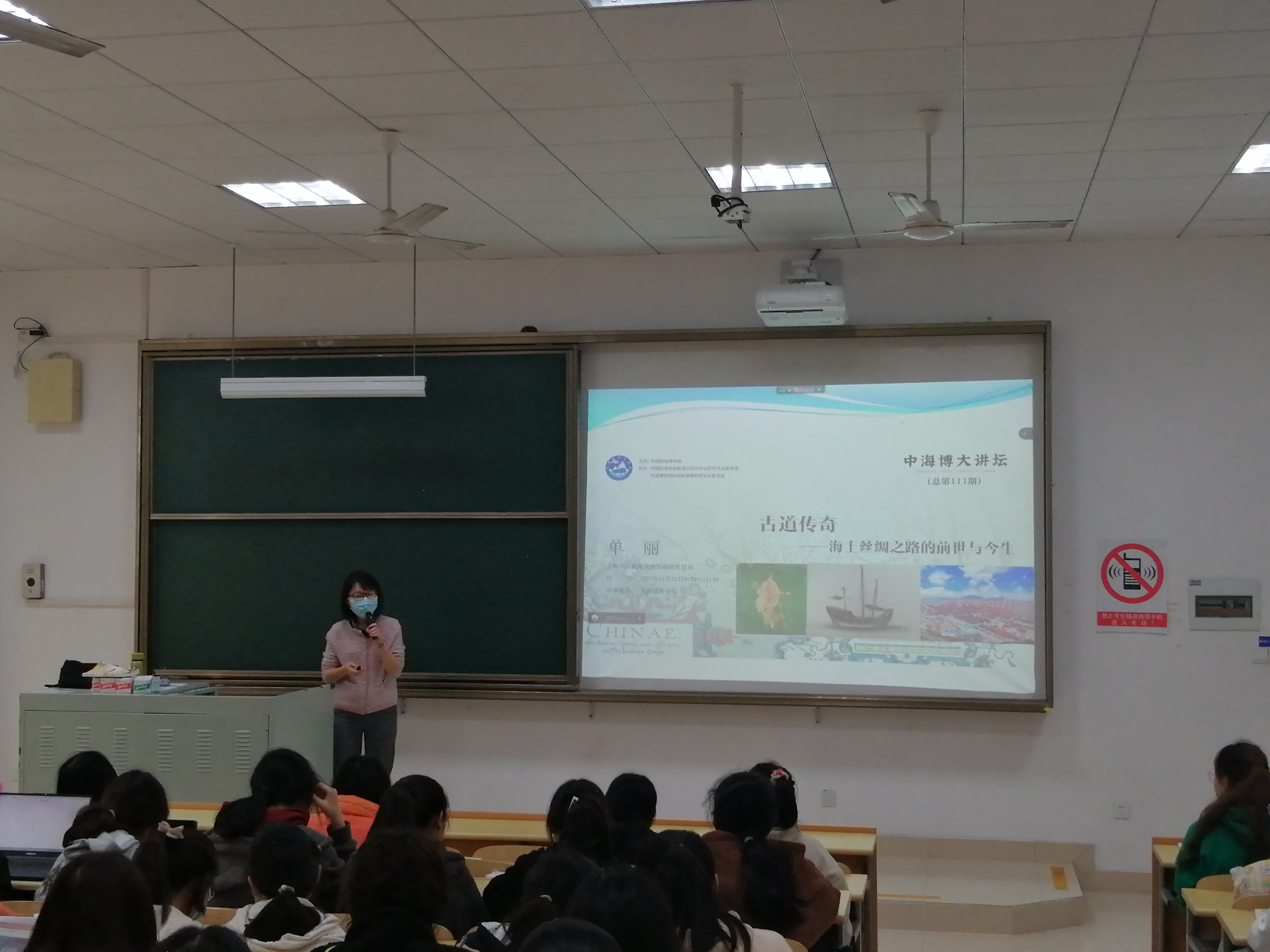 单丽老师以“古道传奇——海上丝绸之路的前世今生”为题,从“丝路”的想象,名义入手,引入“前世之因:古代海上丝绸之路”,到“China与世界:海上丝绸之路沉船与贸易瓷器”,再到“今生之缘:21世纪海上丝绸之路”;从“汉使西去与大秦东来”到“海贸大宗:丝路绵延、瓷彩变幻、茶香弥远、珍宝香料”,从“文化交流:佛光普照、茉莉花开、指向行舟、海神妈祖、海客他乡”到“物种往来:口腹之欲、珍禽异兽”,再到一带一路、经济文化交流,把整个海上丝绸之路的前世今生阐述的透彻清楚。