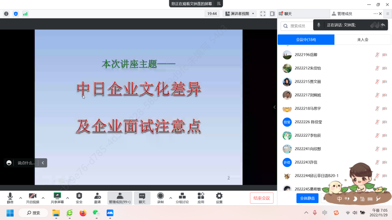 2022年11月29日晚上,外国语学院日语系有幸邀请到上海电力大学外国语学院日语系主任、区域国别科研团队负责人文钟莲教授,为我校外国语学院日语系20级、21级约220名同学进行了题为“探析中日企业文化异同点”的学术讲座。本次讲座由外国语学院与科研处共同举办,由日语系主任刘尔瑟老师主持。