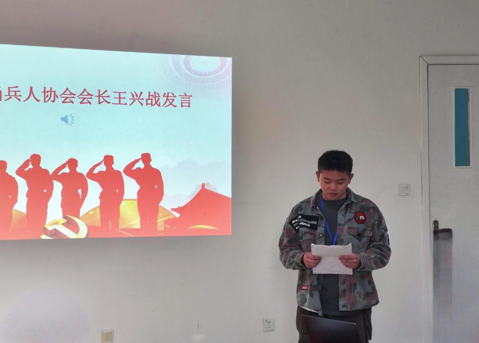 首先,闻传当兵人协会会长王兴战同学发言。他倡议退役军人发挥不怕苦、不怕累,内务整洁,作风优良等传统和作风,切实落实好学院党委领导和辅导员老师们的要求,克服困难,引导全体男同学们逐一解决宿舍可能出现的违纪、不及格等问题,逐步达到优良水平,为学院社区建设贡献力量。