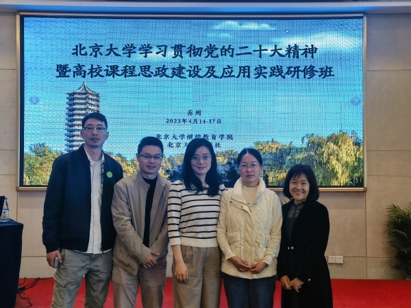 全面推进高校课程思政建设是深入贯彻习近平总书记关于教育的重要论述和全国教育大会精神、落实立德树人根本任务的战略举措。近日,商学院党委书记刘爱香,课程思政示范专业旅游管理系系主任、“双带头人“教师支部书记华玉,工商管理系系主任王鹏,旅游管理系专业教师秦月,学院党委宣传委员、办公室主任徐光硕一同前往苏州,参加由北京大学继续教育学院、北京大学出版社共同举办的“北京大学-学习贯彻党的二十大精神暨高校课程思政建设及应用实践高级研修班”。