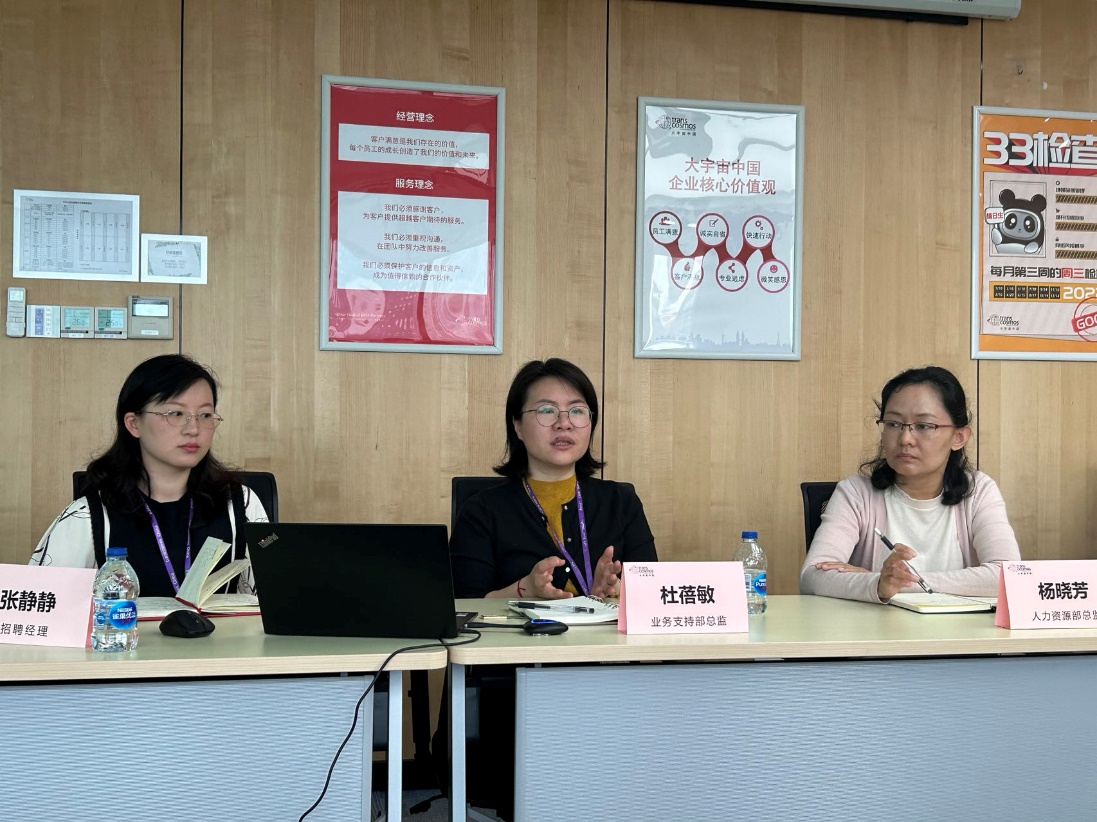 伊莉副书记向大宇宙介绍了外国语学院学生生源分布与具体专业人数规模,希望通过本次交流会建立校企合作长效机制。最后招聘经理张晶晶介绍了外国语学院毕业生目前在大宇宙就职的情况与未来人才管培机制。