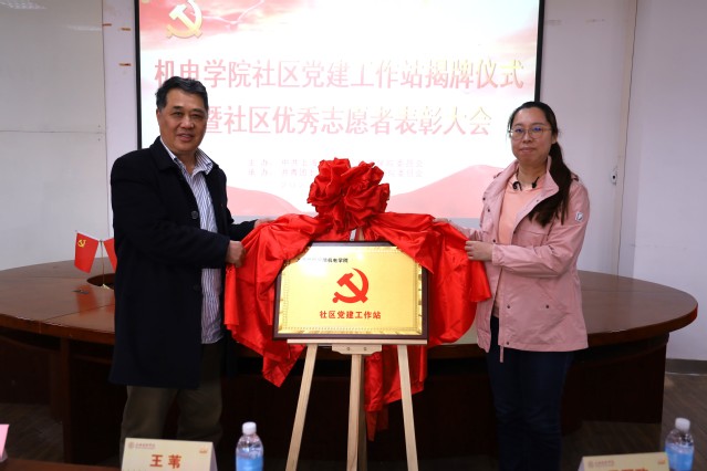 机电学院党委副书记马秀娟宣读了社区优秀志愿者表彰名单,学生代表胡正楹同学代表志愿者上台发言。最后,在全体与会党员师生代表的共同见证下,吴书记和陈静老师为机电学院社区党建工作站揭牌。相信机电学院社区党建工作站将在大家的共同努力下,办出特色,办出成绩,真正的把党建进社区工作落到实处。
