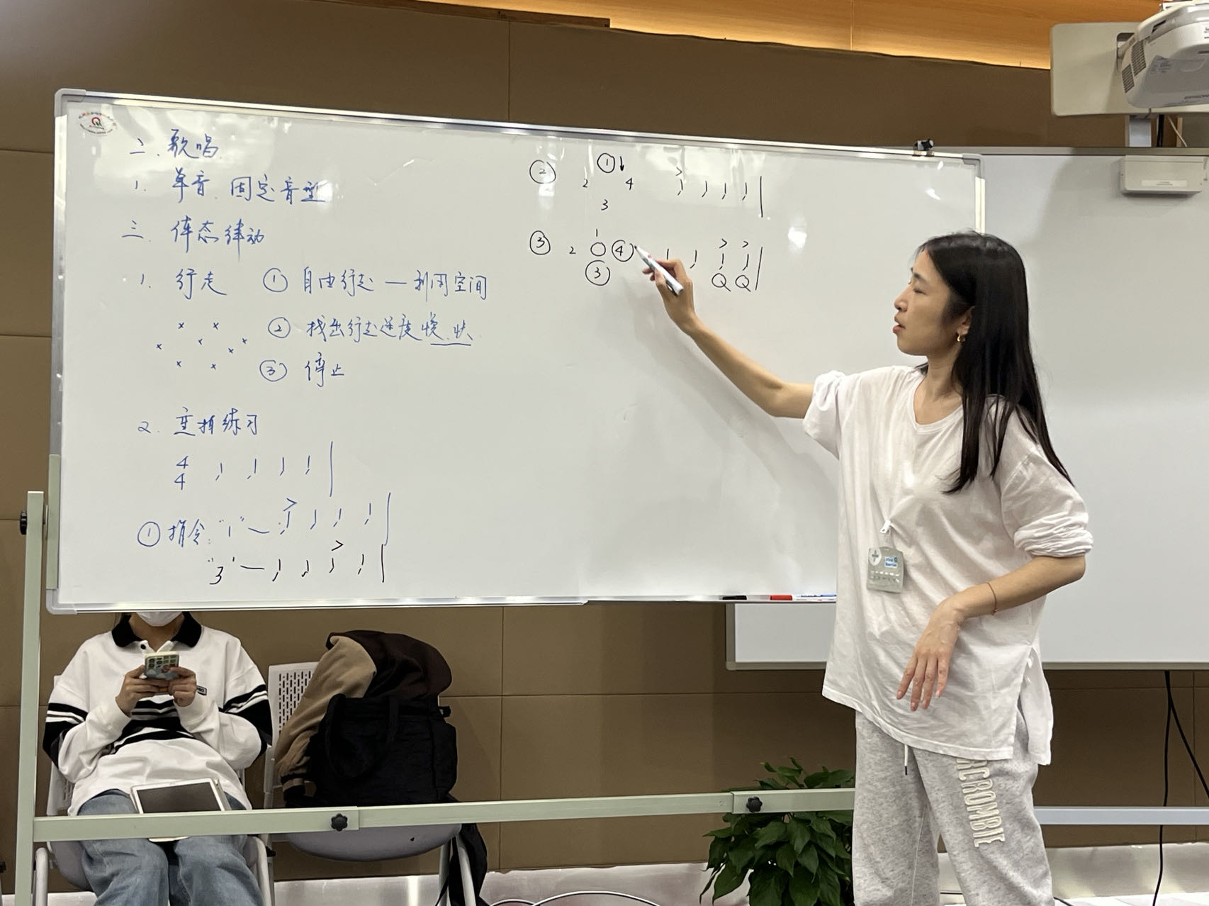 第三天和第四天的培训由陈蓉主讲和带领,内容分为理论讲授、体验和答疑三部分。理论部分,陈蓉讲授各种乐器的特点和使用方法,以及如何在心理健康教育活动中进行音乐治疗的实践。实践部分由陈蓉带领,其助手小卢老师配合,通过拍打身体,发出声音,感受各种不同的声音和节奏,并通过倾听不同音高的声音进行游戏,练习一个人的音乐素养。答疑部分,陈蓉回答学员在心理健康教育中遇到的与音乐有关的问题,尤其关于什么是真正的音乐教育,让学员醍醐灌顶。她表示,音乐是听的艺术,而不是看的艺术,有些孩子可以弹奏钢琴曲,但是听不出钢琴琴键上的声音,这不是真正的音乐教育。
