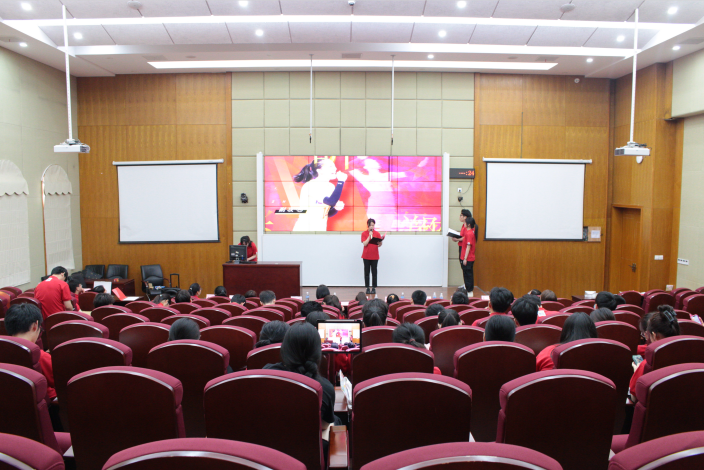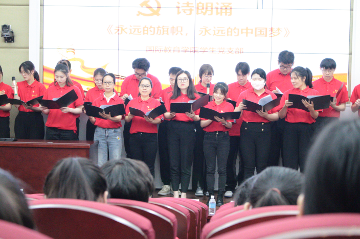 当师生们还沉浸在配音比赛的感动和感悟中,国际教育学院学生党支部的师生们带来了一首《永远的旗帜,永远的中国梦》诗朗诵,以此勉励在座所有师生定国安邦的远大梦想由你我,由千千万万的中国人共筑,我辈应听党话、跟党走,用吾辈之青春吹响新时代号角,共筑中国梦。