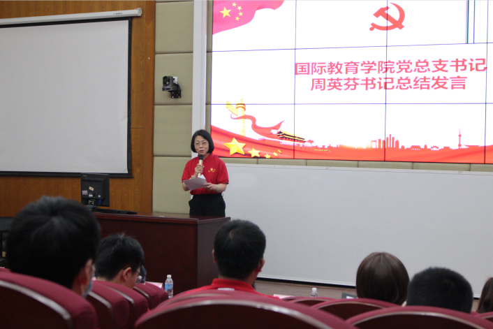 活动最后,国际教育学院党总支书记周英芬为本次活动进行总结,她表示经典的红色影片片段配音声声入耳,将听众都代入到了一部部党的百年奋斗历史片段当中,这一系列中国共产党人的精神都有其时代内涵,在如今依旧闪耀着灿烂的光芒,希望这些精神能如种子一样在每个人心中生根发芽,开花结果。并希望师生党员和入党积极分子们就像播种机一样,将伟大建党精神的种子遍撒于所在的班级、寝室、校园和家庭中,以及今后就业的企业行业,赓续红色血脉。周书记勉励师生们从伟大建党精神中汲取奋发的智慧和力量,坚定理想信念,学习贯彻习近平新时代中国特色社会主义思想,以学铸魂、以学增智、以学正风、以学促干,在以中国式现代化全面推进中华民族伟大复兴中,贡献我们的青春和热血。