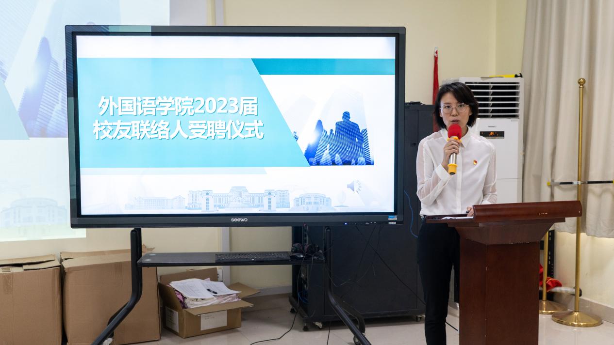 伊莉副书记颁发了校友联络员聘书,她说到,校友联络员毕业后要与同学、校友、学院经常保持联系,积极参与校友会相关活动,向学院建言献策,及时反馈优秀校友事迹,宣传学校发展建设成就。无论以后大家走多远,外国语学院永远都是同学们的坚强后盾,学院也会时刻关注同学们的发展,欢迎同学们常回家看看。
