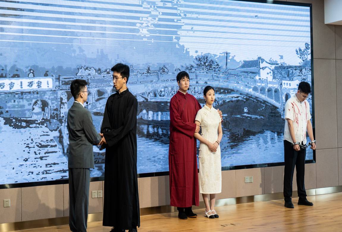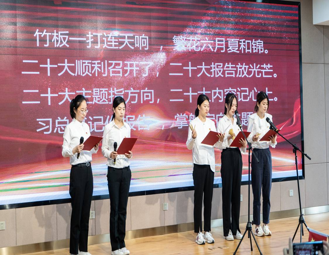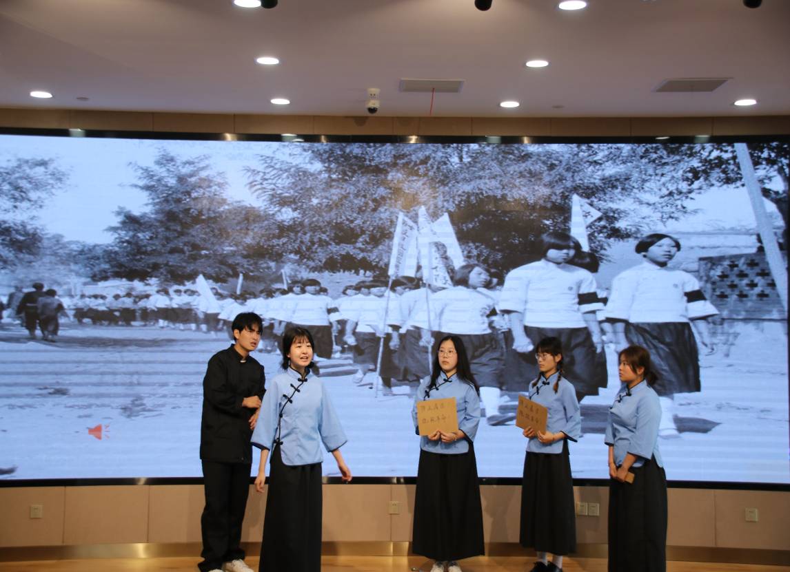 在第一篇章的表演中,来自学生党支部的红色情景剧《黎明前的诀别》,选取了朱聚生献身革命的三个片段,通过一名大学毕业生的独特视角,引导观众走进朱聚生的生命时空和他的内心世界,去感受朱聚生的不怕牺牲、舍小家为大家的家国情怀;英语系教师党支部《建国大业》配音,所选片段是毛主席和妇女代表关于中华人民共和国国旗图案选择的讨论,生动再现了党和国家的重要历史时刻;红色情景剧《醒悟》,以穿越的方式,带领人们回到党成立初期,为了民族独立和人民解放,中国共产党与无数仁人志士一起踏上了探寻救亡图存的道路,使人们明白无数革命先烈抛头颅洒热血的奉献才换来今天的幸福生活;朗朗上口的唱词,清脆的快板声,行政教师党支部带来的快板说唱,让党的创新理论转化为通俗易懂的快板词,生动地传递到观众们的心坎上。师生们精彩的表演,让在座的同志们感受到党的百年奋斗积累了宝贵精神财富,党的伟大思想给予我们前行的力量,映照现实、远观未来,不断总结经验、提高本领,不断提高应对风险、迎接挑战、化险为夷的能力水平。