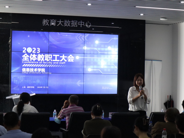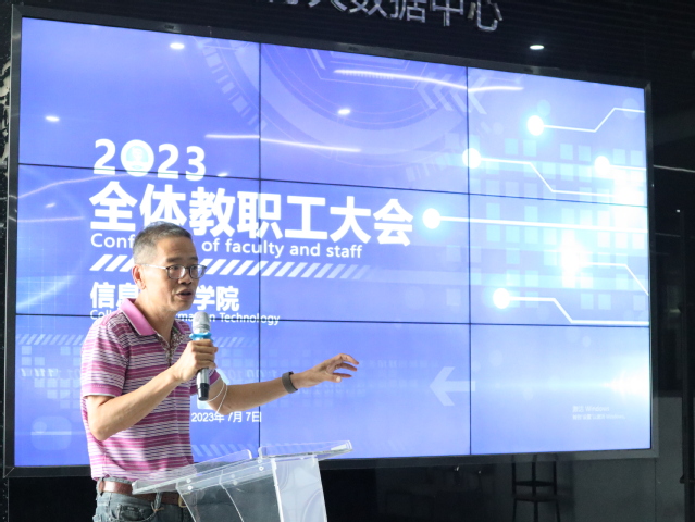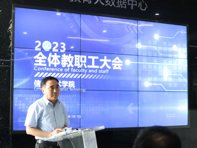7月7日上午,信息技术学院在学院楼421召开全院教职工大会暨教育教学工作大讨论总结交流会。副校长杨俊和教授莅临指导并发表讲话,学院党政领导出席,全体教职工参加会议。会议由学院院长张文俊主持。