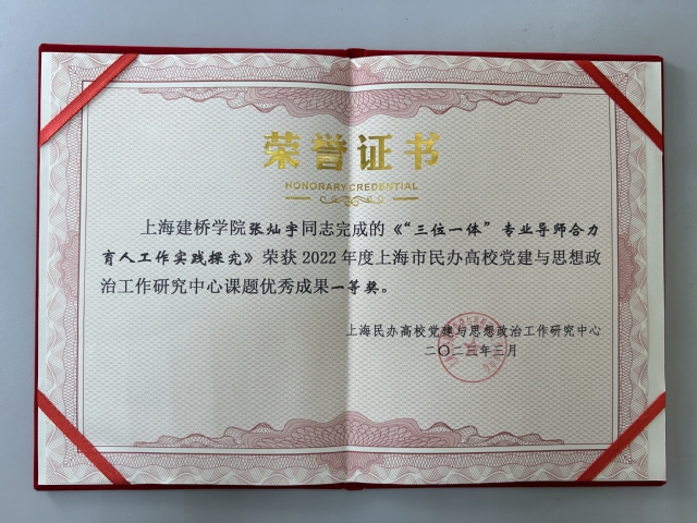 近日,由上海民办高校党建与思想政治工作研究中心组织的民办高校党建与思想政治工作研究中心课题优秀成果评选活动落下帷幕,我院辅导员张灿宇凭借《“三位一体”专业导师合理育人工作实践研究》项目荣获2022年上海市民办高校年度党建与思想政治工作研究新课题优秀成果一等奖。