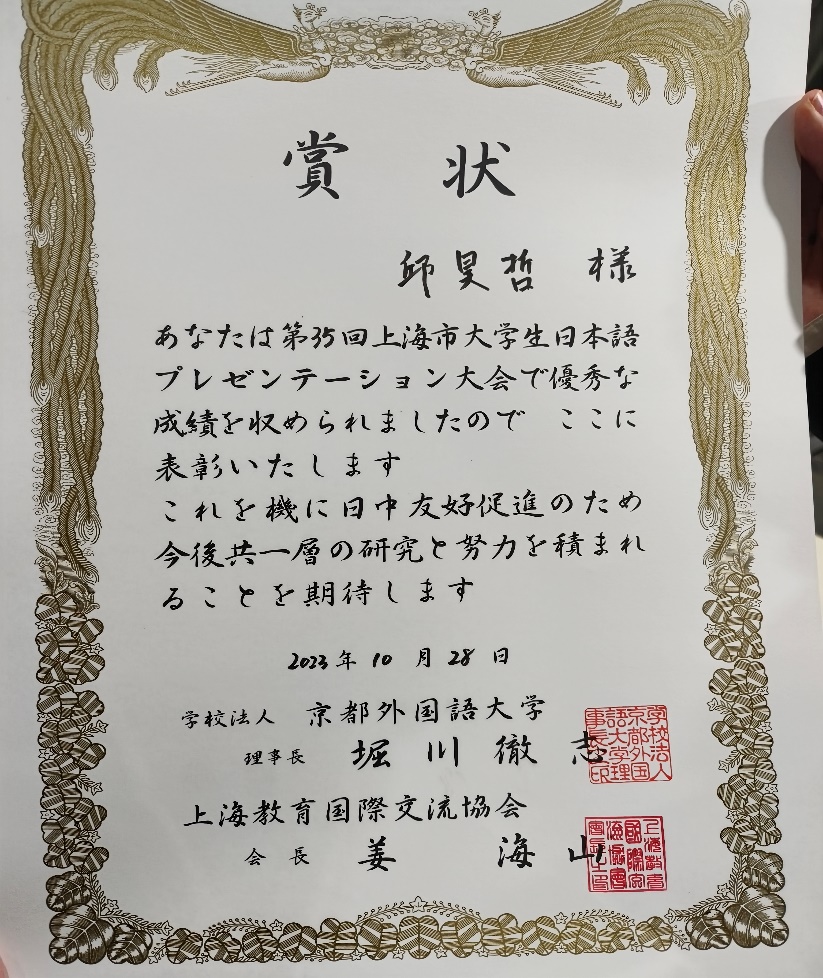 我校国际教育学院日语专业21级学生邱昊哲参加了此次比赛。为备战此次赛事,国际教育学院日语教学中心认真筹划,由外教增田美砂老师担任指导,从演讲题目选择到文字打磨都进行了精心准备。比赛当日,日语教学中心主任杨晓兴、教授邱根成、外教增田美砂以及学生代表亲临比赛现场,为邱昊哲加油助威。最终,邱昊哲同学获得优胜奖,虽未获得前三名和日本关西研学的机会,但邱昊哲同学能够充满自信地与复旦大学、上海交通大学、上海外国语大学等名校同学同台竞技,展现自我风采,也是值得鼓励和赞赏。