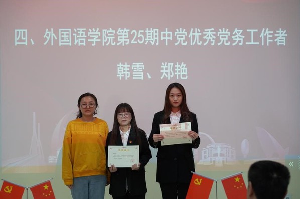 学院党委为赵逸凡、吕婕颁发了中党优秀学员,为韩雪、郑艳颁发了中党优秀党务工作者。赵逸凡表示,中党培训课程让学员们深刻领悟了党的政治理论方针,党课虽已接近尾声,但大家仍会在日后的学习过程中养成学理论、重实践的习惯,学思践悟、知行合一。郑艳总结了中党培训课程中的所感所思所悟,她认为党务工作者应发挥“船帆”保驾护航的作用,负责每节党课的正常开展,落实培训期间的各项规章制度,做好学员的考勤工作,上传下达保障了中党培训顺利进行。