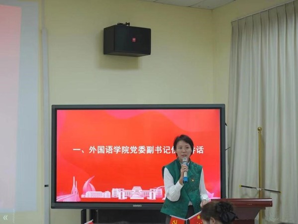 外国语学院党委副书记伊莉发表致辞,时代的责任赋予青年,时代的荣光属于青年,各位入党积极分子要坚定理想信念,端正入党动机,深入学习理论知识,充分发挥先锋模范作用,在新时代征程中无畏前进,啃下硬骨头,应对新挑战,并在实践中检验初心和动机,共同为共产主义事业奋斗、为中国人民的幸福奋斗。