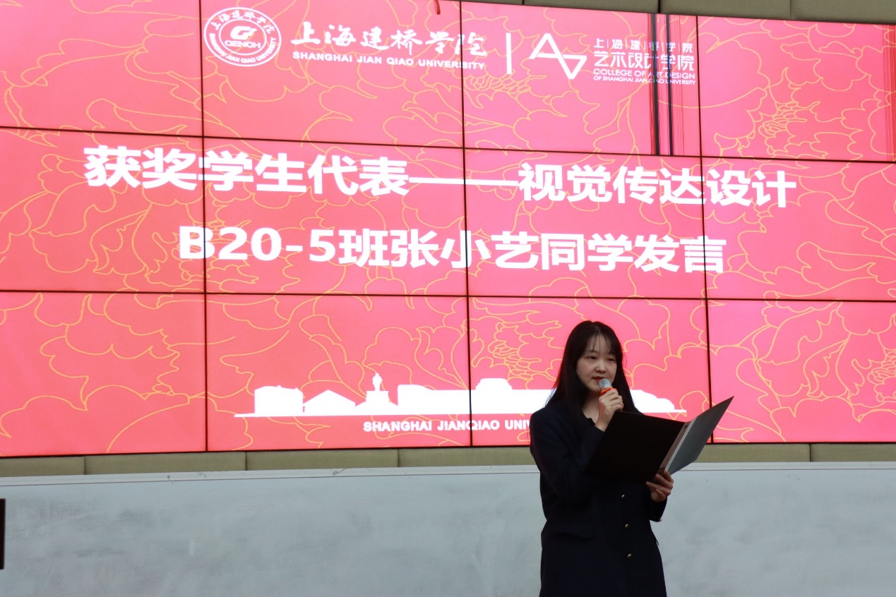 “竞赛优秀个人”学生代表视觉传达设计B20-5张小艺同学发言,激励同学们丰富校园生活,提高专业技能,一要积极利用上课作品投递竞赛;二要大胆地与指导老师沟通交流,了解竞赛机会;三要培养良好的团队合作能力,寻找合作伙伴;四要重视实践的重要性。