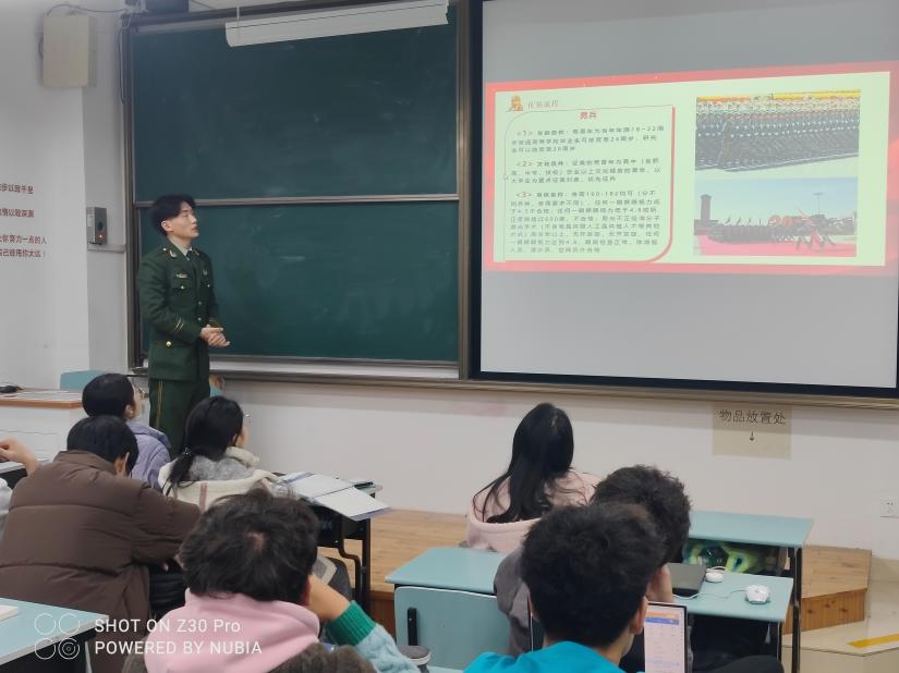 本次征兵宣传活动,由我院征兵负责老师张峰带领优秀退役复学大学生一起担任征兵宣传员。各位退役大学生身着戎装深入课堂,讲解征集标准、征集流程和优抚政策,以身说法展示军营生活,与有意参军入伍的同学进行“面对面,心贴心”的交流互动。