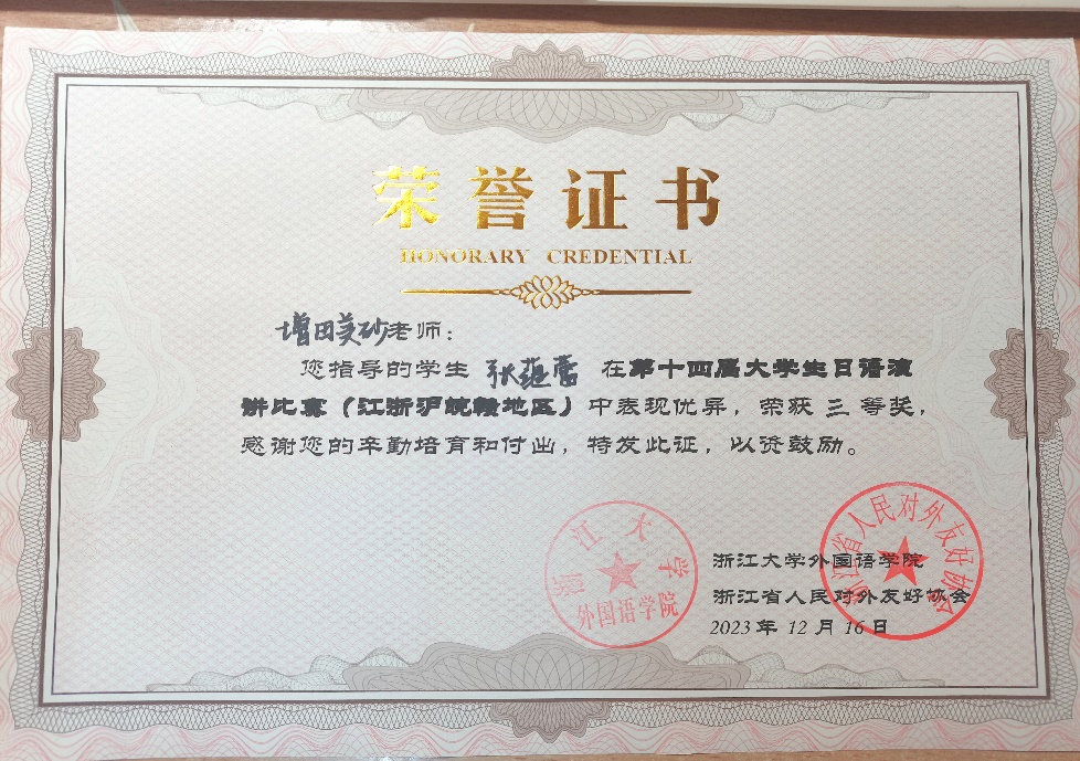 2023年12月16日,国际教育学院日语专业22级学生张蕴蕾参加了由浙江大学外国语学院和浙江省人民对外友好协会共同主办的第十四届大学生日语演讲比赛(江浙沪皖赣地区)决赛,荣获三等奖。