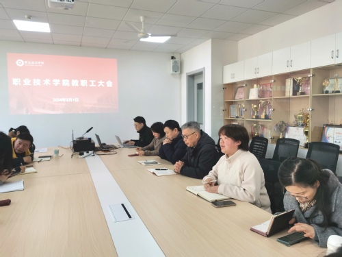 3月1日上午,职业技术学院全体教职工于学院会议室召开了新学期全体教职工大会,学院院长谷伟、党委书记王加宁、副院长陈莲君、党委副书记马冯莉出席,全体教职工参加,会议由谷伟院长主持。