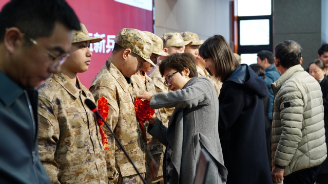 领导们为全体预定新兵佩戴大红花、赠送纪念品,并合影留念。入伍新兵代表申钊印同学代表全体新兵发言,他表示参军入伍是崇高的使命、无私的奉献,将牢记入伍誓言,铭记使命担当。信息学院征兵站站长张峰老师作为教师代表发言,他作为一名曾经服役20年的老兵,忆往昔峥嵘岁月,看今朝新兵入伍,他希望同学们不要害怕困难,不要逃避挑战,勇敢地面对它们,不断总结经验、努力超越自我。