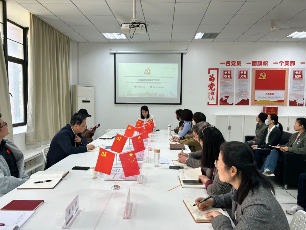 随后,学院党委书记杜鹃就学院党委工作情况进行了详细汇报,汇报内容从党委基本情况、党建工作基本情况、党建工作成效三大方面进行展开。杜鹃书记表示外国语学院党委始终坚持以习近平新时代中国特色社会主义思想为指导,学院党建工作以问题为导向,围绕四个问题展开工作举措:一是开展标准化规范化建设,在软硬件上补齐短板;二是注重凝聚师生,推动教育改革发展;三是推进体制机制建设,不断增强党组织的引领力;四是把准政治方向,深化党建内涵建设。落实立德树人根本任务,用党建“造血”和“强筋骨”,始终不渝抓好教师思政和师德师风建设,全面推动党建工作提质增效,以“用外语讲好中国故事”实现党建工作与业务工作有机融合、同频共振,推进学院“一融双高”建设。