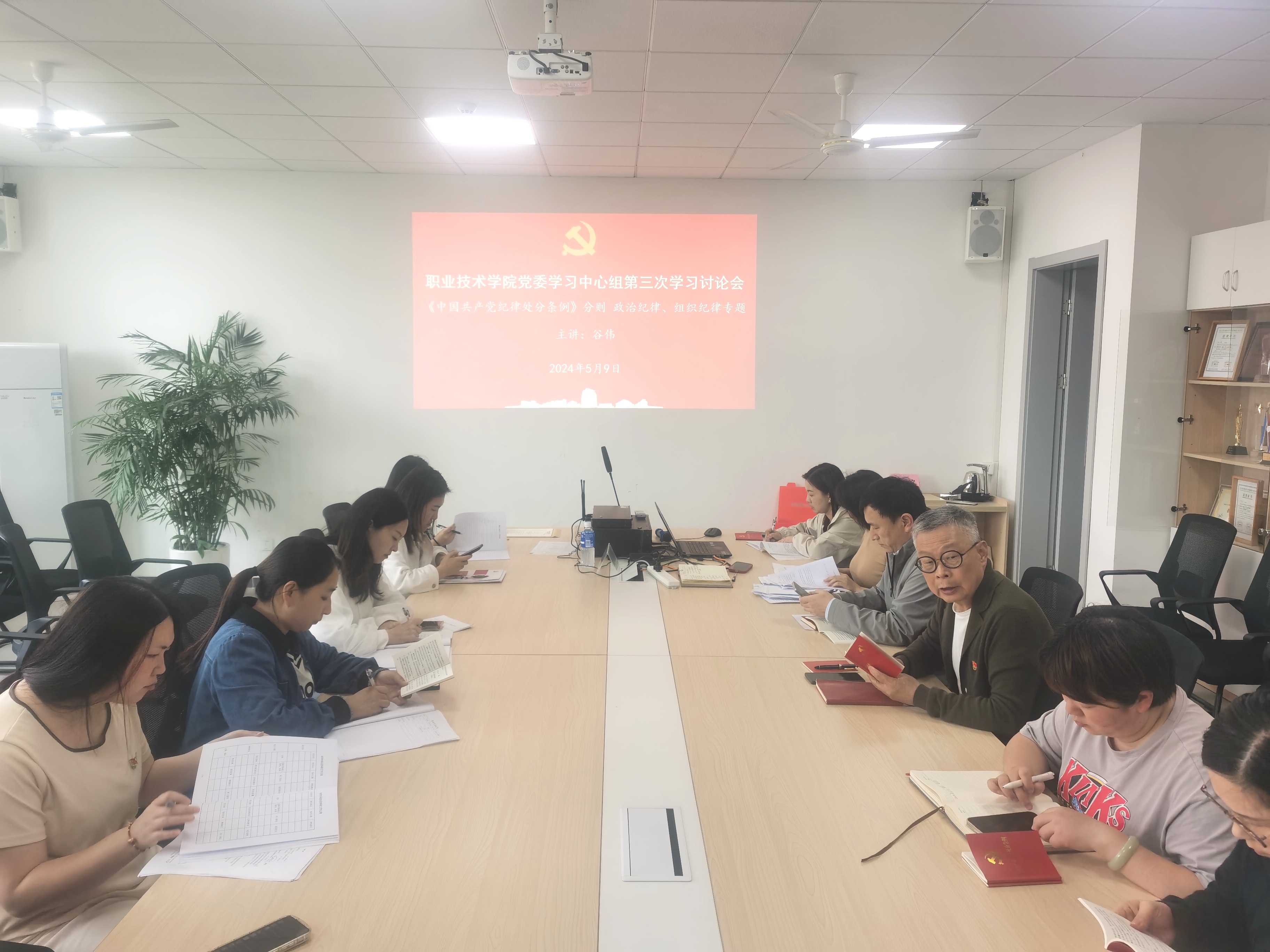 2024年5月8日下午,职业技术学院党委学习中心组第三次集体学习讨论,党委书记王加宁首先介绍了本次中心组学习的主要内容为《中国共产党纪律处分条例》中第六章和第七章的内容,包括“对违反政治纪律行为的处分“和”对违反组织纪律行为“相关内容。院长谷伟领读了该两章具体内容,并根据内容结合工作实际做了主要发言,与会成员结合工作实际作即兴交流发言,通过学习,中心组对党的政治纪律和组织纪律有了深层次的理解和体会。