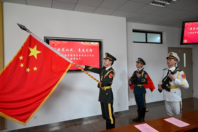 由八一社国旗护卫队参与接送国旗,体出席人员面向国旗,以饱满的精神状态奏唱“中华人民共和国国歌”
