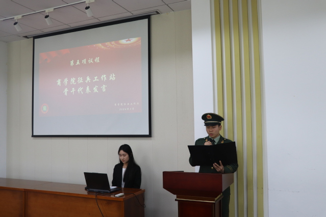 商学院征兵工作站副站长王耀兵讲述了自己的参军生涯并对未来工作站工作作出以下规划:一、充分发挥宣传带动和示范引领作用,在学院国防教育、军训、征兵等各项工作中发光发热,二、通过面对面沟通和点对点的传达为广大学生宣传好征兵政策,答疑解惑,做好学生的服务工作,三、开展预征对象摸底调查,精准掌握学生学业情况、入伍意向、现实表现和身体状况。