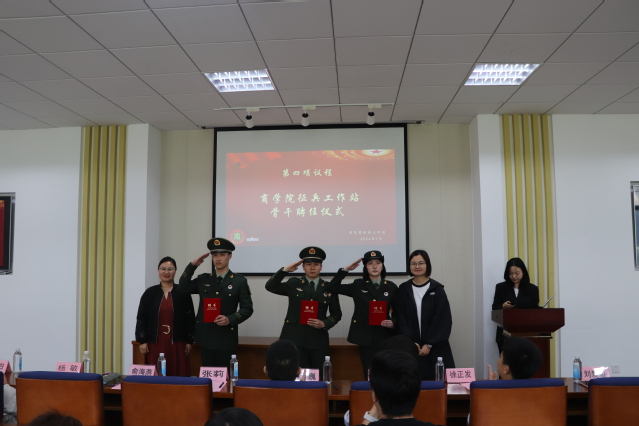 上海建桥学院武装部副部长张莉、商学院党委副书记俞海燕为商学院征兵工作站学生骨干颁发聘书。