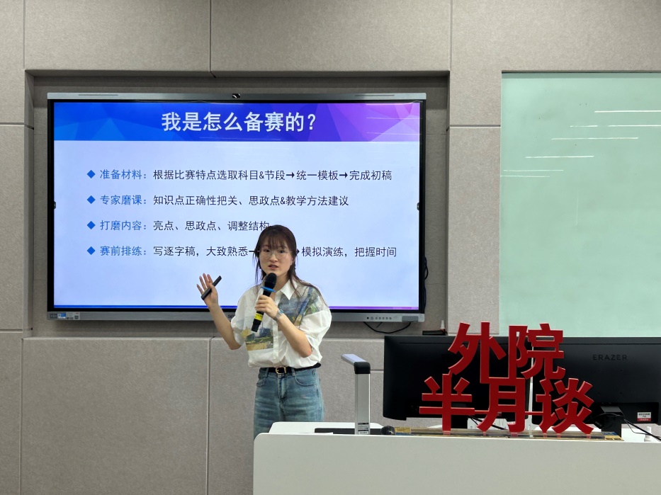 本期“外院半月谈”由竞赛经验说、课程示范说和备赛展示说三部分组成。竞赛经验说邀请了在历次教学竞赛中获奖的教育学院副院长陈苏婷、以及在市青教赛获奖的国际教育学院贺亚茹老师分享参赛经验;课程示范说由2023年上海建桥学院教师教学竞赛”特等奖获得者张晶晶老师进行示范展示;在备赛展示说环节,外院今年三支教学竞赛活动参赛队伍进行赛前展示。