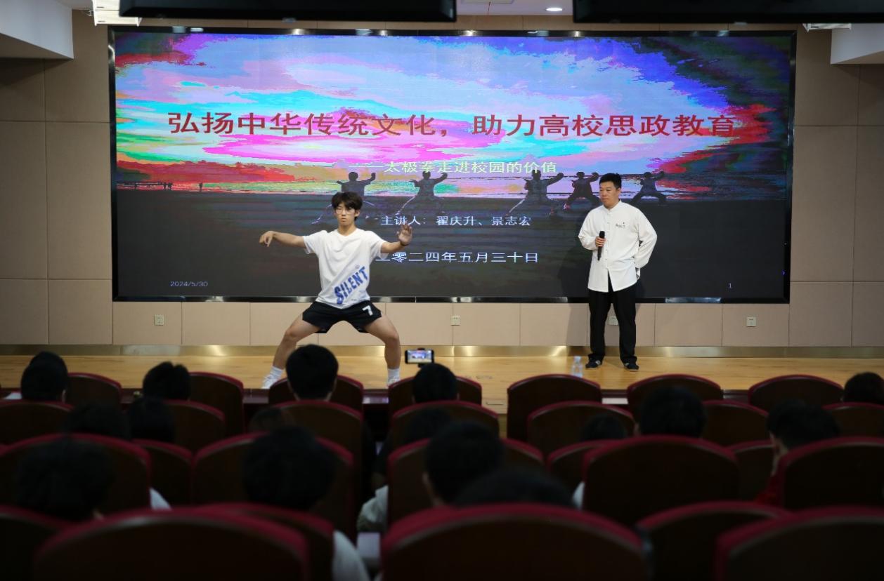 上海陈宗太极馆翟庆升馆长讲授了太极拳源远流长的历史,解析了其承载的传统文化的丰富内涵,并用深厚的武术功底,精彩演绎了陈式太极拳刚柔相济、快慢相间、松活弹抖、缠绕折叠、连绵不断的运动风格,精彩的表演赢得了阵阵掌声。翟馆长表示,通过练习太极拳可以帮助学生调节情绪,增强应对挑战和困难的能力,提升身心健康水平。