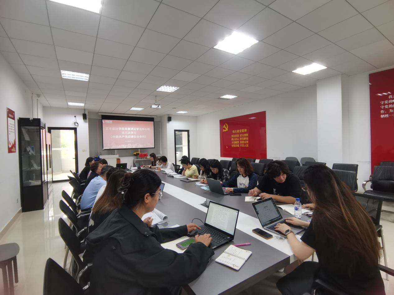 6月12日,艺术设计学院党委理论学习中心组在艺术3223会议室开展第三次学习《中国共产党纪律处分条例》,学院党委委员、党支部书记、学院督导、各系办正副主任参加学习。