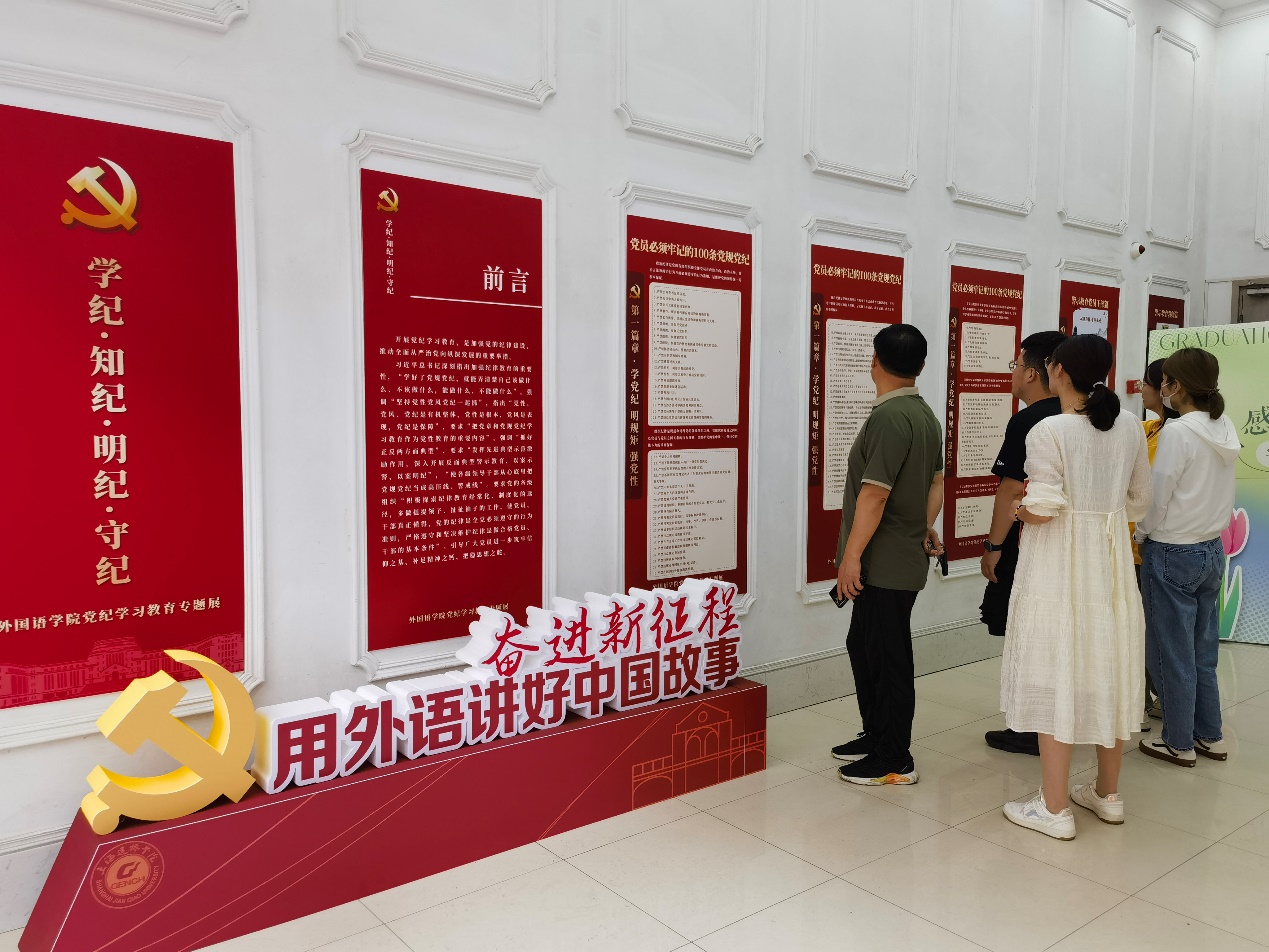 党课结束后,行政党支部全体党员来到外国语学院北门厅一同参观学习了外国语学院党纪学习教育专题展。大家深入学习了“学纪、知纪、明纪、守纪”专题展“学党纪、明规矩、强党性”、“学案例、 知敬畏、 守底线”以及“学典型、树新风、当先锋”三个篇章,全面了解了自己该做什么、不该做什么,能做什么、不能做什么。