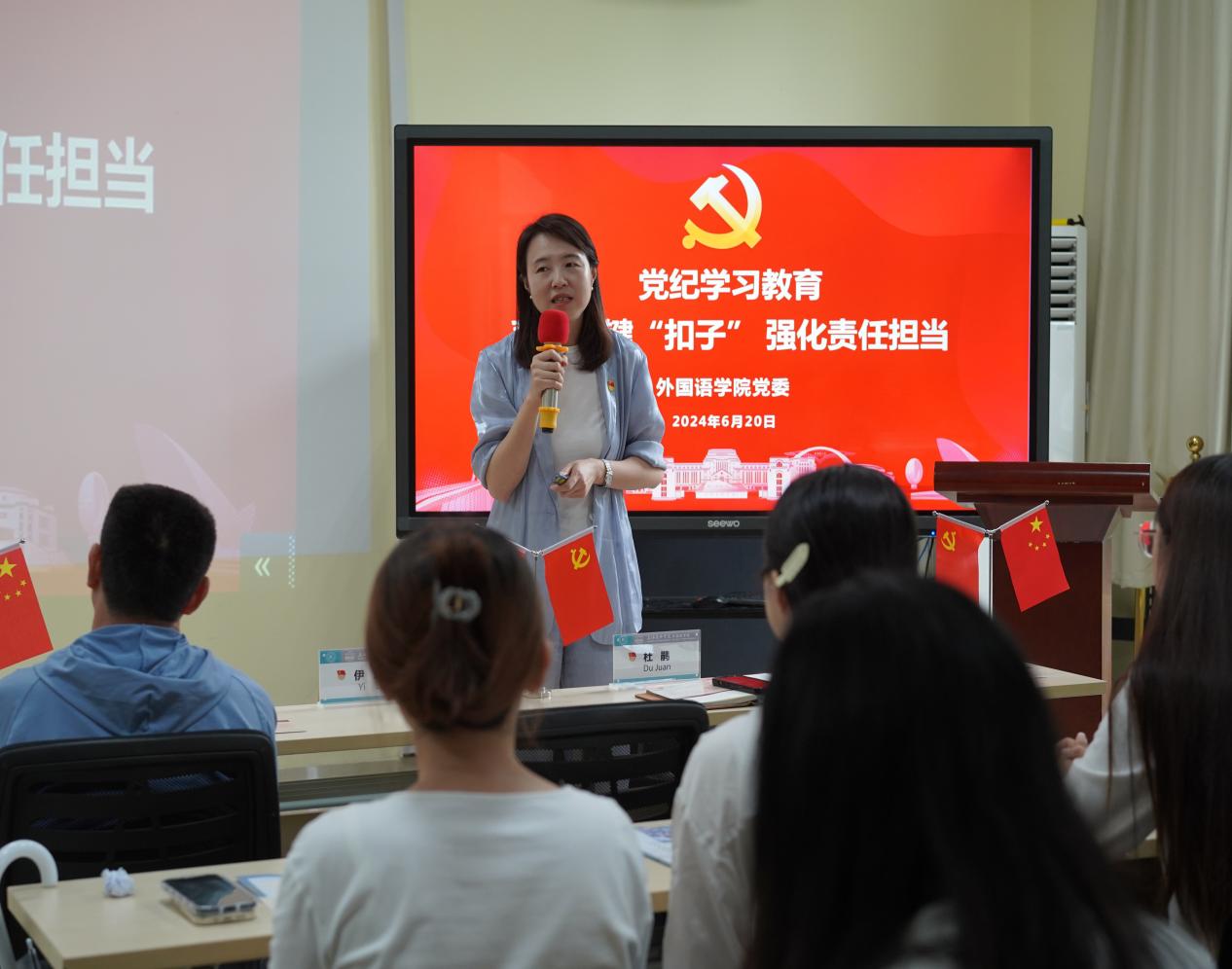 为推动党纪学习教育走深走实,教育引导全体毕业生党员坚持不懈用习近平新时代中国特色社会主义思想武装头脑,自觉增强“四个意识”、坚定“四个自信”、做到“两个维护”,强化遵守纪律的政治自觉、思想自觉和行动自觉,2024年6月20日,外国语学院举办了以“传承初心守纪于心,凝心聚力迈向未来”为主题的2024届毕业生党员校教育活动。出席本次活动有外国语学院党委书记杜鹃、党委副书记伊莉、第一学生党支部书记赵磊、第二学生党支部书记方毓锦,第三学生党支部书记吴多发、毕业班辅导员,活动由党委组织员刘沛雨主持。