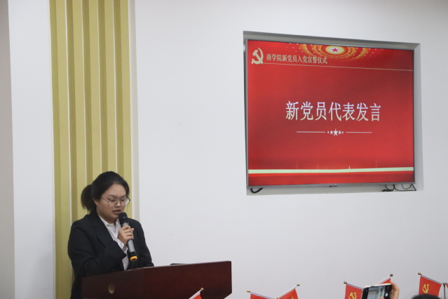 随后,全体新党员移步至商学院党建服务中心,高声奏响激昂的《没有共产党就没有新中国》,并在党旗下由赵婉琦老师带领完成庄严宣誓。