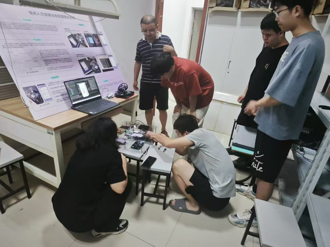 4月初,团队怀着帮助解决慢病患者中面对的种种问题的夙愿,带着利用科技与创造缓解现代医疗压力的希望,提出了建立慢病人员自我健康管理系统。该系统可实时监测使用系统的患者的心率血氧舒张压伸缩压情况以及实时位置,可预检癫痫情况并上传至手机app中。该项比赛历时四个多月,期间参赛学子面对技术上的挑战与心理上的压力,常常在信息技术学院107实验室熬夜到深夜,不断调试,不断寻找最优解决方案。在讨论会上激烈争论,碰撞出许许多多的创意火花。