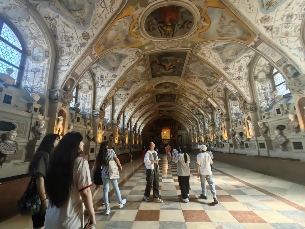 在慕尼黑王宫,学生亲身体验了这座从昔日皇家住所演变而来的艺术与文化宝库。王宫内部,壁画、雕塑和装饰艺术的丰富藏品,栩栩如生地讲述了巴伐利亚地区丰富的历史与艺术传统,引领学生们穿越历史的长河,直观地感受到文化的深度与力量。宁芬堡宫以其宏伟的建筑和精致美丽的宫廷花园,给学生们的心灵带来了深刻的触动。18世纪的法式建筑在这里与东方艺术精妙融合,尤其是阿玛琳宫内部的装饰艺术,令学生们惊叹于两种文化交汇所产生的独特魅力。中国元素的融入不仅彰显了中国风对欧洲艺术的影响,更让学生们体会到了跨文化交融所带来的美学享受和文化多样性的丰富内涵。
