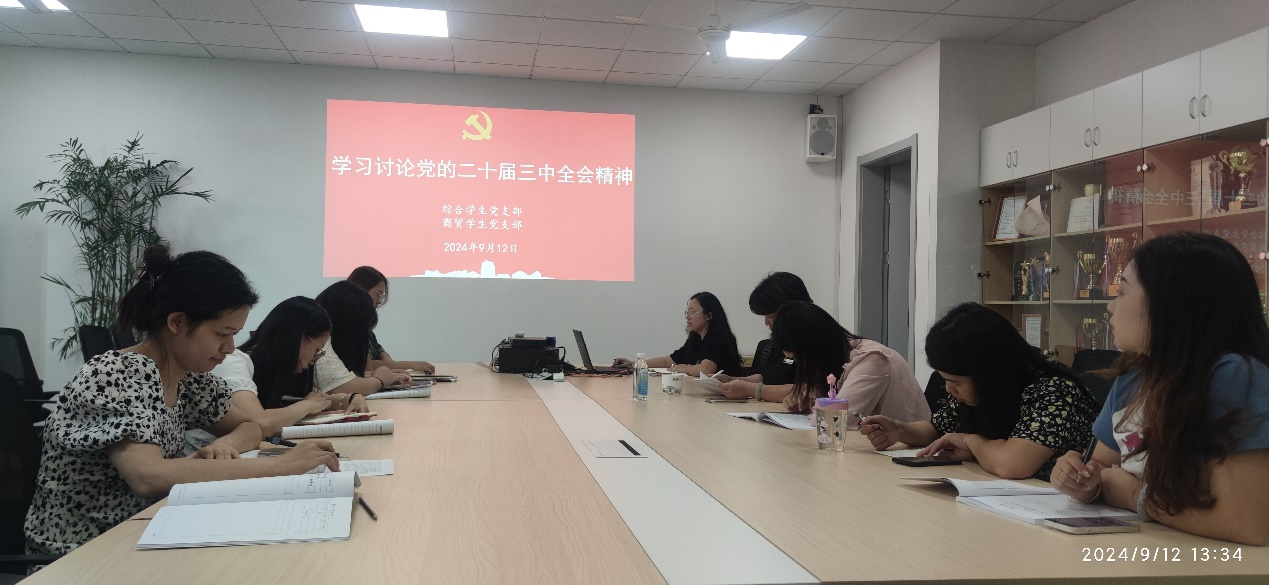 9月12日下午,综合学生党支部、商贸学生党支部在会议室419联合开展党的二十届三中全会精神专题学习会,学习《中共中央关于进一步全面深化改革、推进中国式现代化的决定》。本次会议由职业技术学院党委组织委员廖艺晗主持,院党委副书记马冯莉,学生支部全体教师党员参会。
